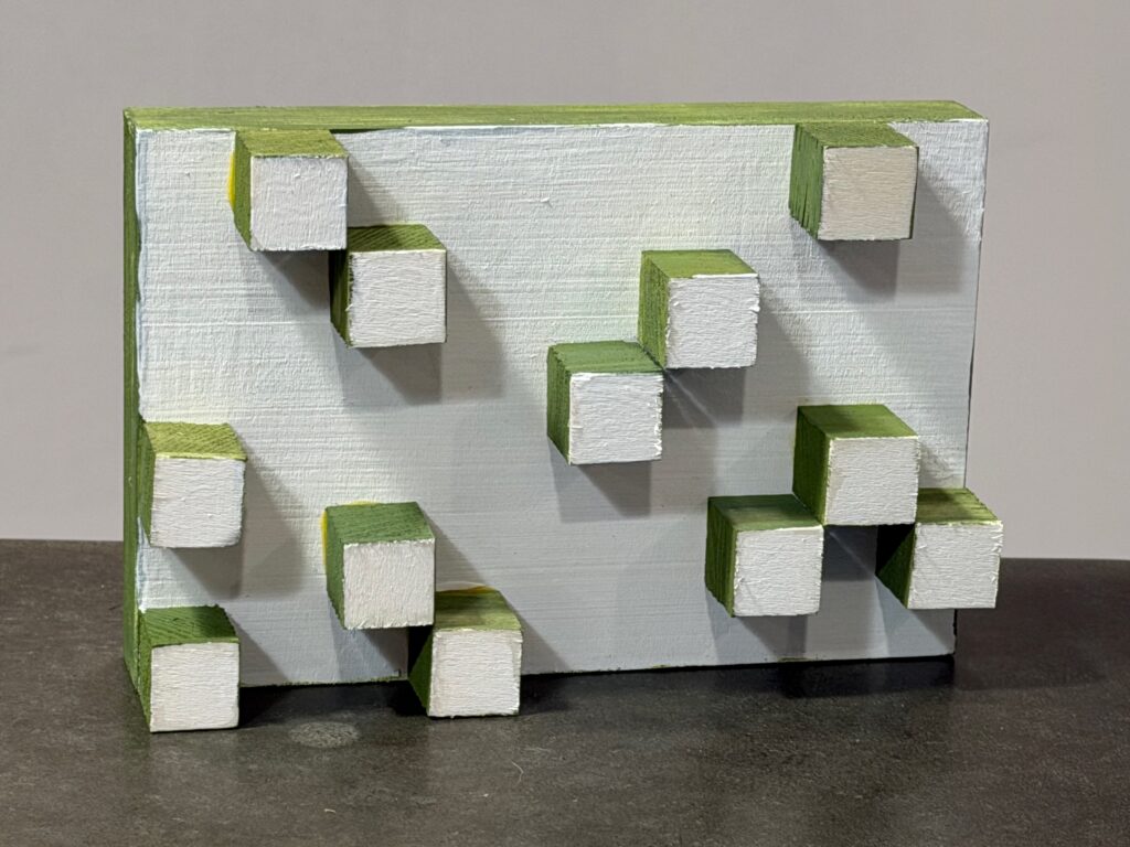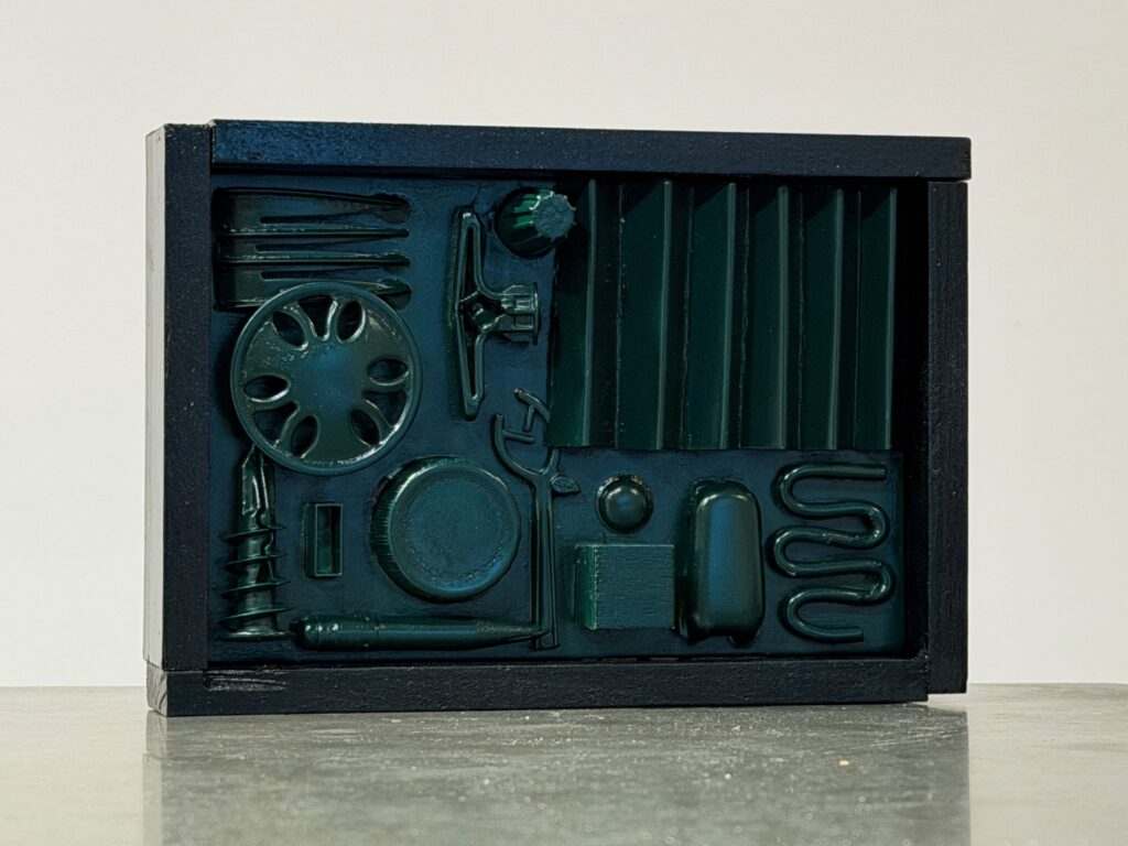 Nevelson’s Big Black (1963) influenced the third piece, especially in its emphasis on composition through assemblage. While her work relies on a monochrome palette and the scale contributes to the overall impact, what stood out to me was how distinct objects become unified through color and arrangement. I translated that idea into a small relief made of found and constructed elements, all painted in deep green. By flattening everything into a near-single tone, the focus shifts to shadow, spacing, and the relationships between forms.